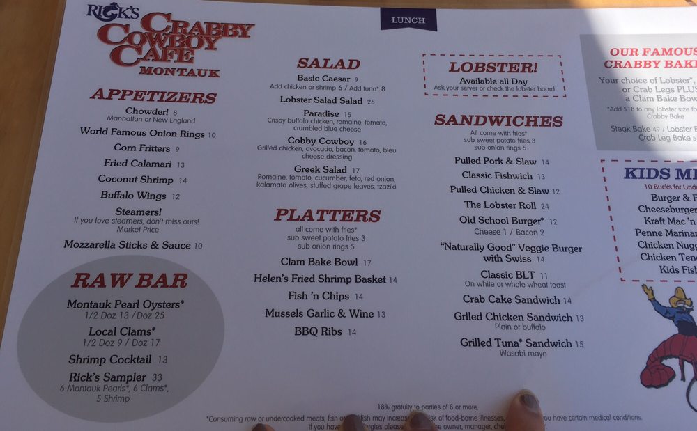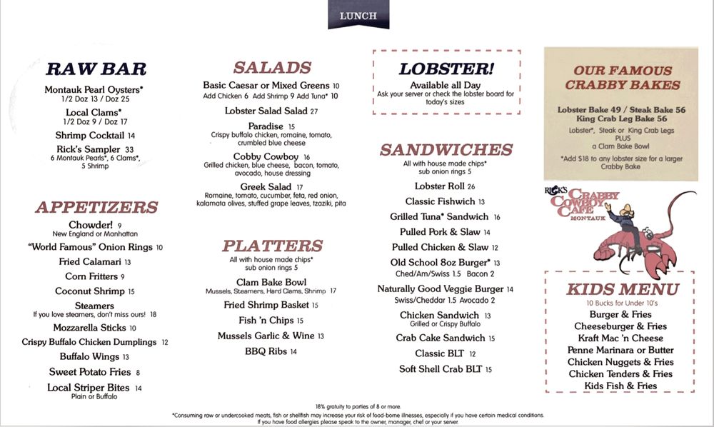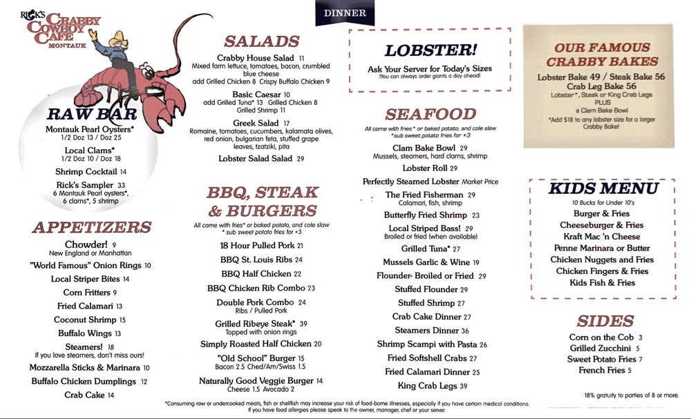 Welcome to Rick's Crabby Cowboy Cafe, a hidden seafood gem located at 435 E Lake Dr, Montauk, NY. This charming cafe offers delightful ocean views and a relaxed atmosphere perfect for enjoying fresh seafood dishes. Here, you'll discover a menu that showcases local flavors, from the renowned lobster roll to the standout Striper sandwich. Customer favorites like the crispy onion rings and the flavorful Fisherman’s Platter have garnered rave reviews, with diners praising the quality and preparation.